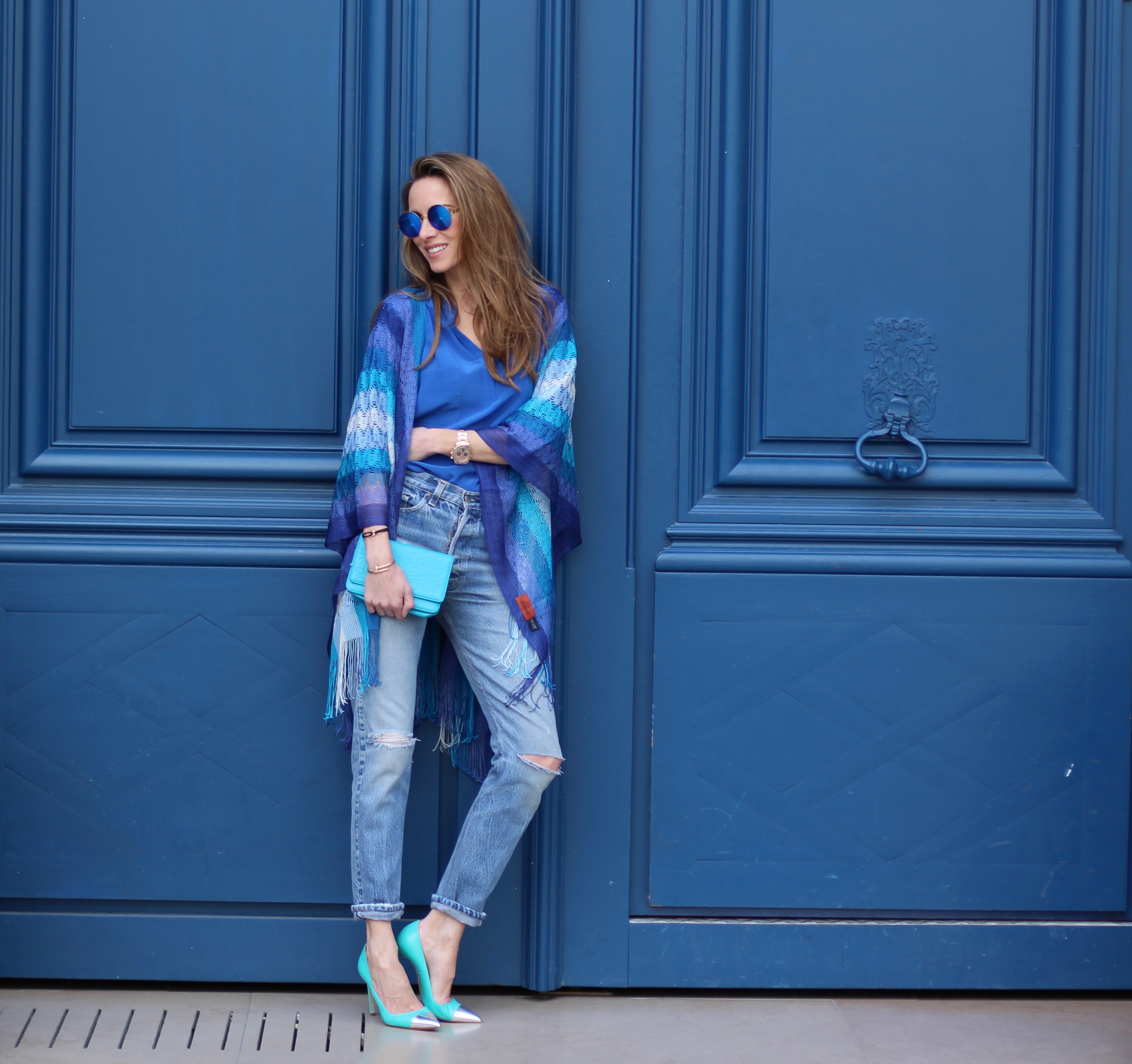 your outfit. Very often it has an easy, sometimes hippy touch. How do you like this cape with its different blue shades? Blue is one of my beloved colors. It is the color for trust, honesty and loyalty and it reduces stress. So for me, as a leo, it’s the perfect cape & color to calm down 😉