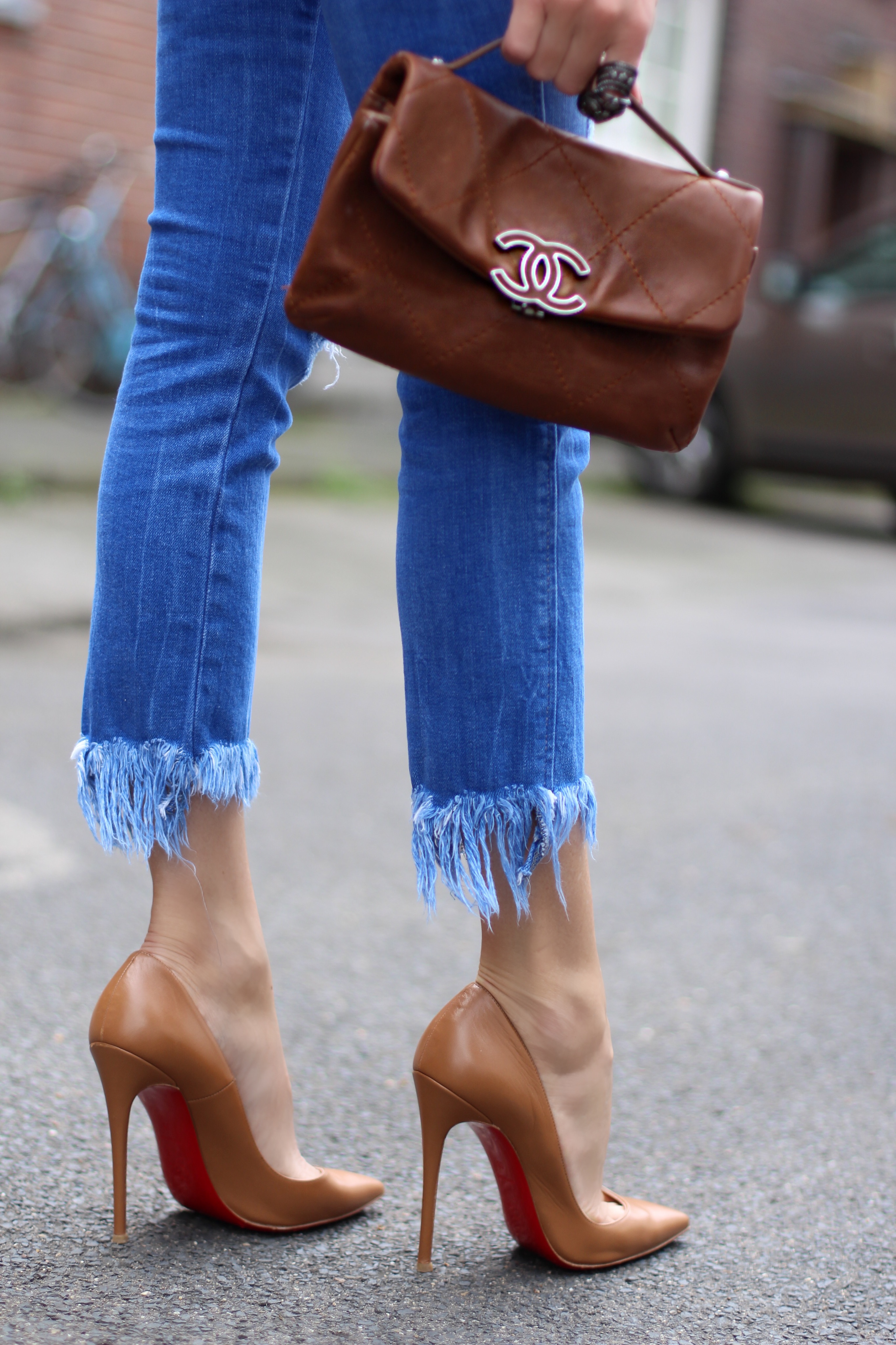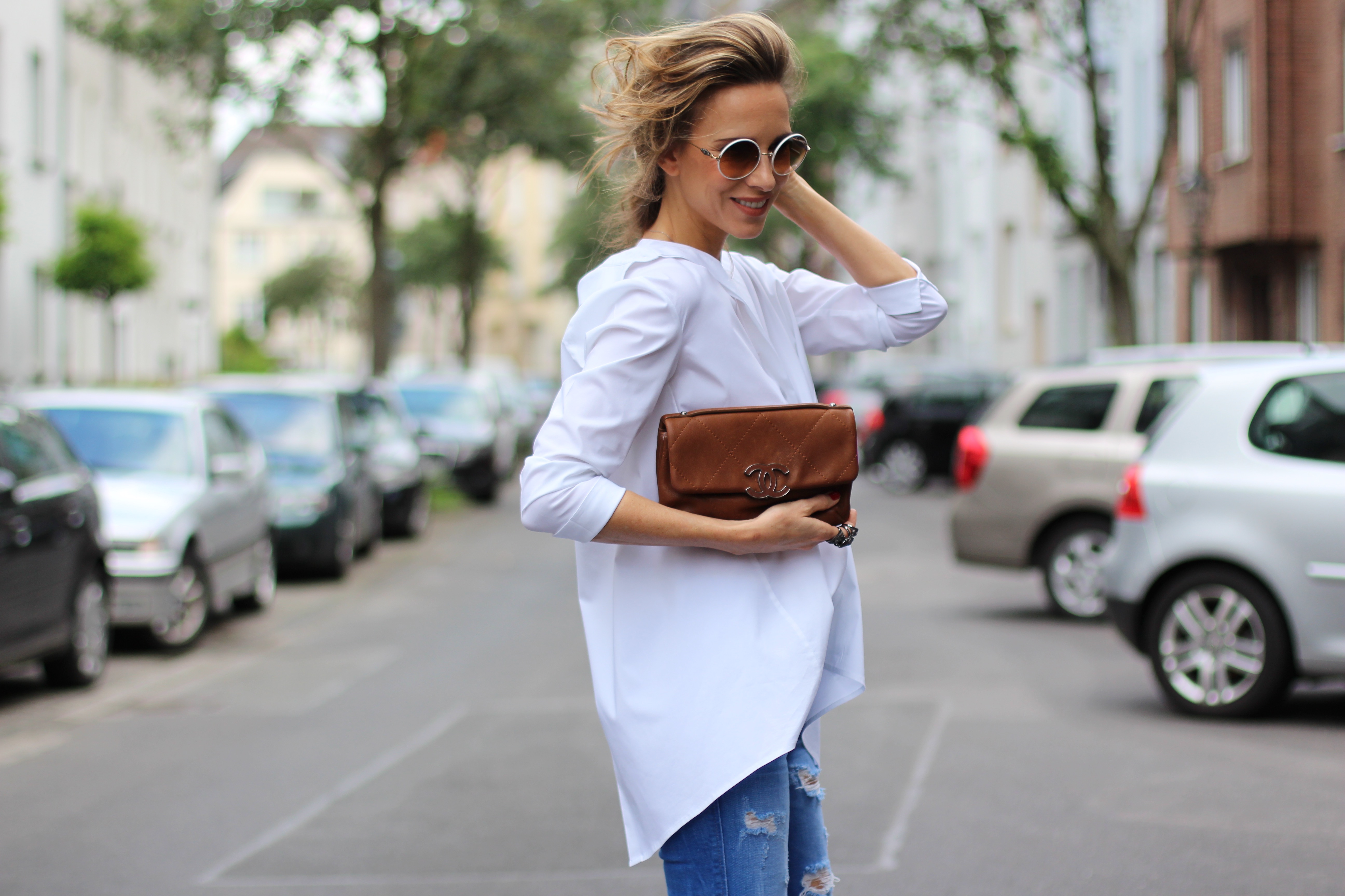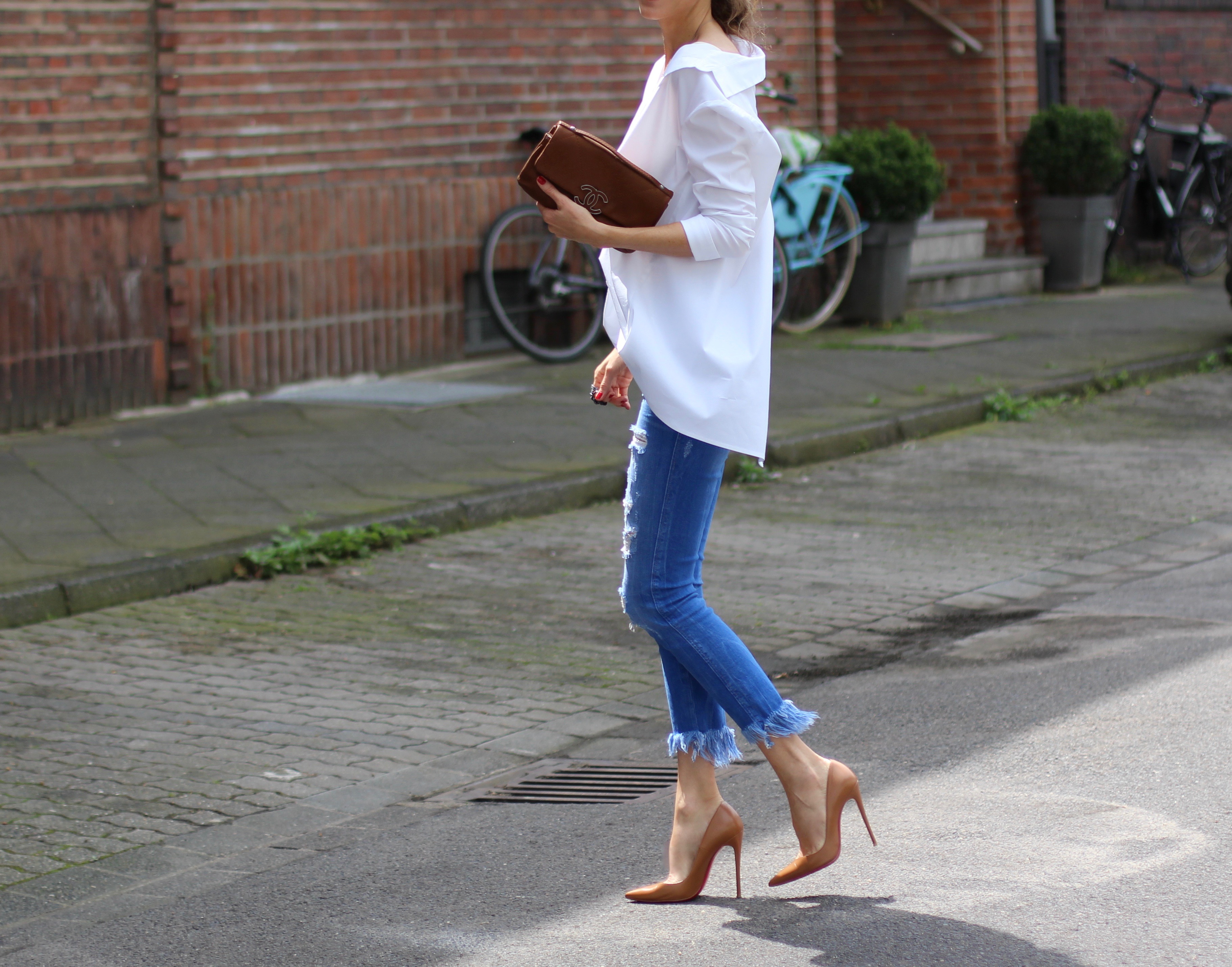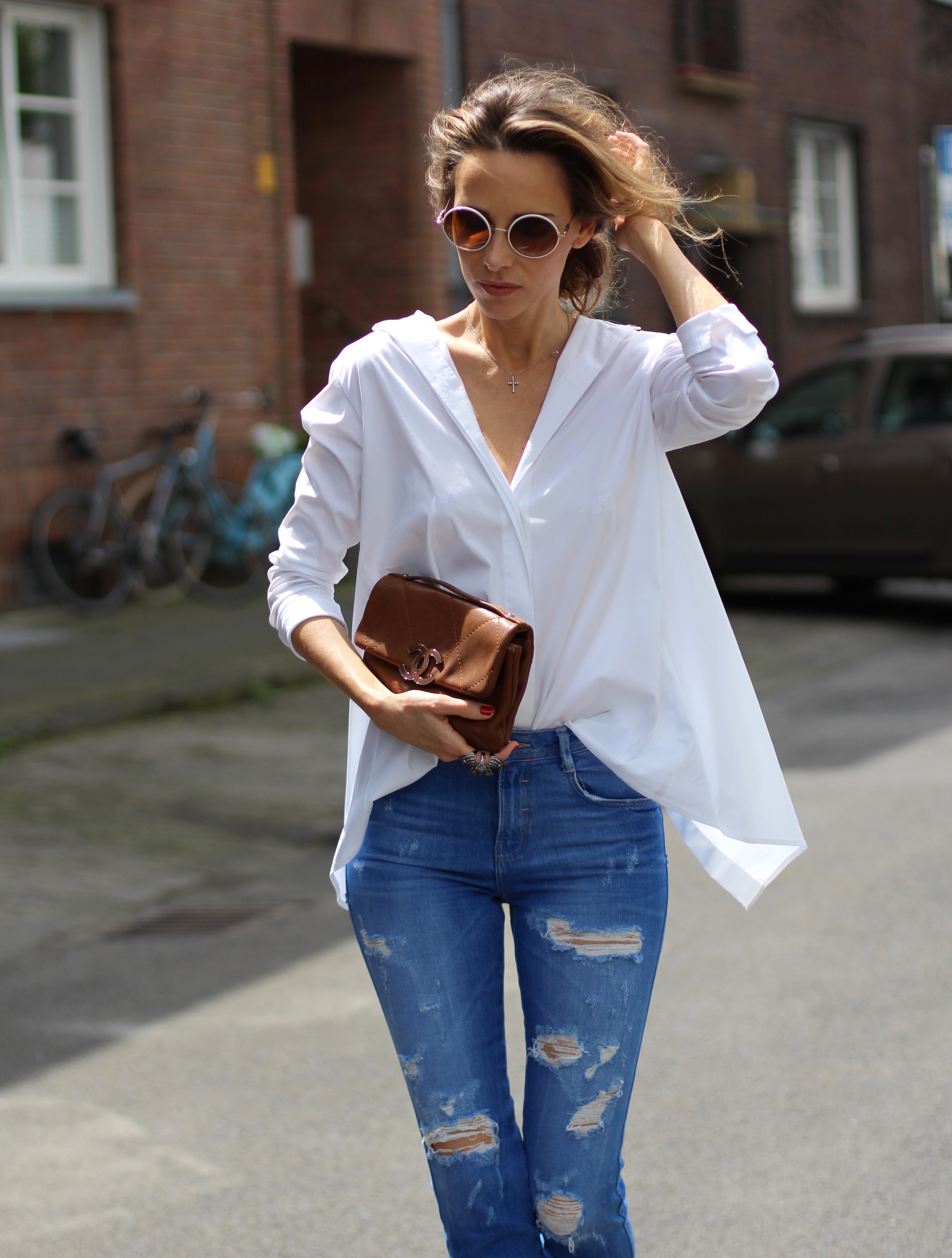 My Christian Louboutin high heels in cognac match perfectly with my vintage Chanel bag. It’s a perfect classic accessory for this shirt. My fringed and destroyed jeans from Zara brings the outfit some contrast and makes the look not too elegant but rather edgy. By that I tend to give my outfits something in between cool and chic. An other sportive way to wear this blouse is to match it with tapered trousers and some sneakers or flats. If so, I would close the buttons on both sides. And I can promise you: you will have a perfect restyle by using the same shirt!