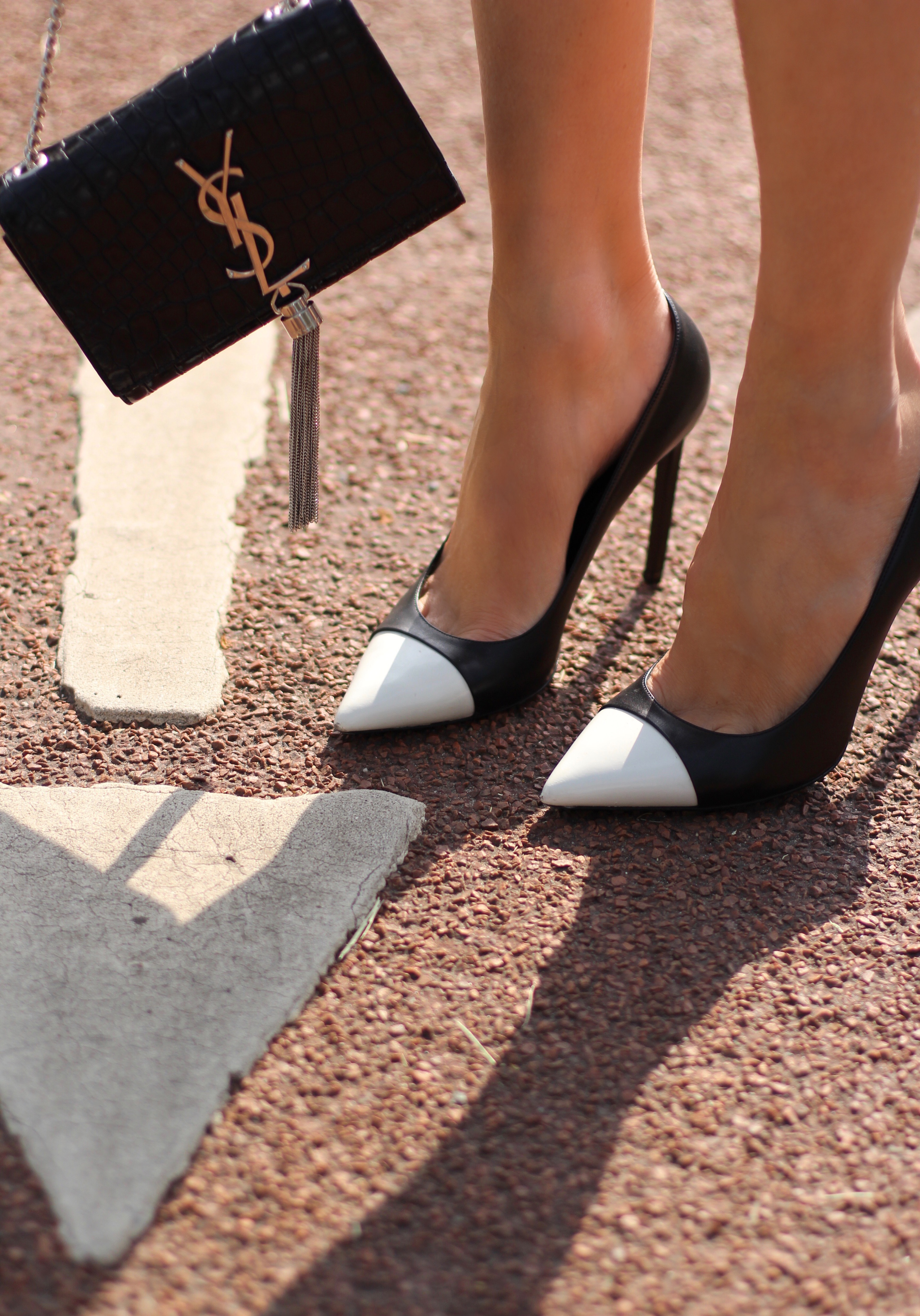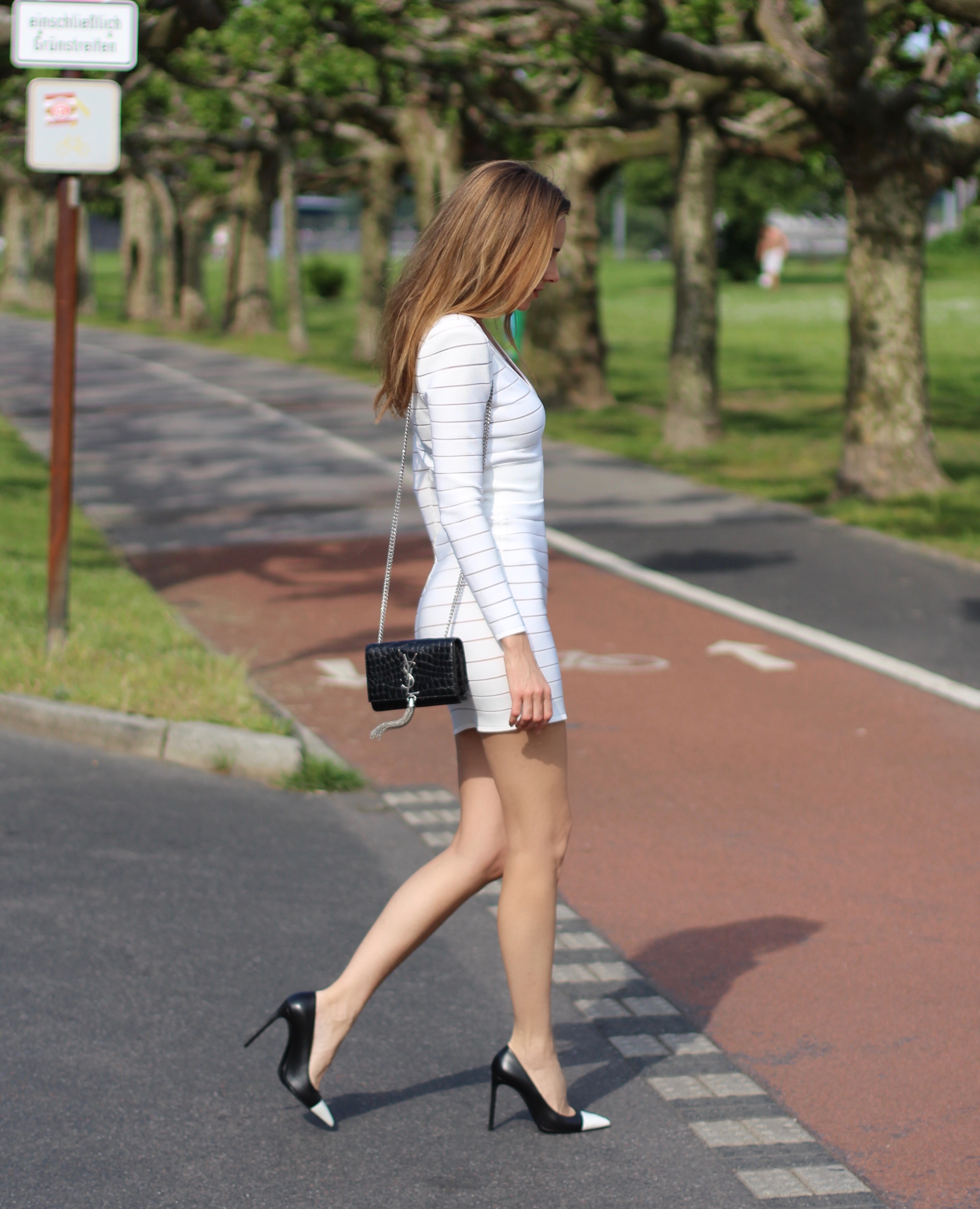 The white Balmain dress, I’m wearing in this blog post is from this season. I bought a very similar one from Balmain in black, almost three years ago. I think it’s important to spend the money on classic pieces, which are wearable for a long time. I have to admit that I’m a collector – and my wardrobe is bursting at the seams right now. So in the future I have to get rid of some of my clothes and sell them. But as mostly all of my clothes are more timeless fashion pieces, I can wear them again and again – like most of my bags and my shoes. The ones I wear on the pictures are about four years old and I still love them a lot. Unfortunately Saint Laurent is not making any more of these two-tone models in black and white. For me a perfect color combination for black and white clothes. But as you can see I wore them quite a lot on many of my previous posts. The model of this shoe is still available in black and a classic pumps of Saint Laurent, also perfect with a little white dress.
