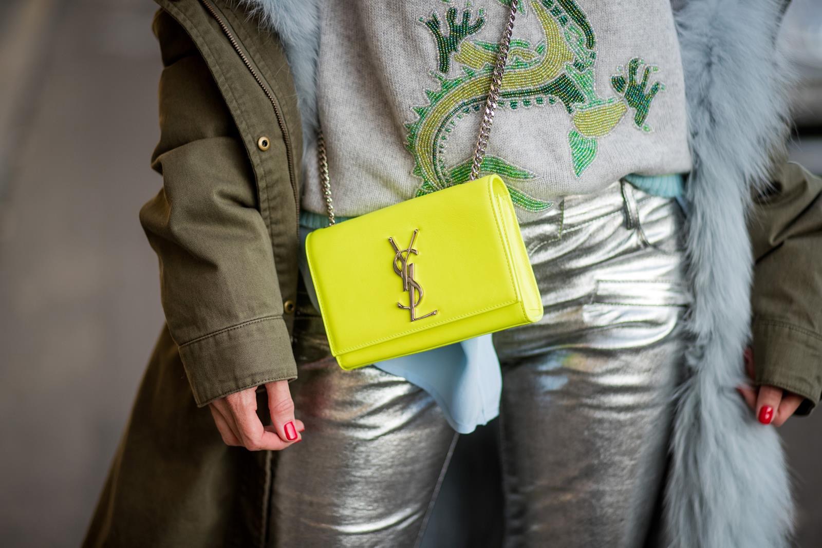 With my silver pants I am wearing a long blue silk blouse from Equipment. The fine material is beautiful on my skin and the light color adds up nicely to the shiny bottom. Over it I slipped into a grey cashmere pullover by Heartbreaker with a cool dragon application. I really enjoy the clash of fabric mixtures, a soft silk and cashmere with cool leather items – its fun to mix styles and materials. As you can see I rolled up the silver pants on the bottom, leaving some space around the ankles and leaving room for my neon So Kate heels from Christian Louboutin. To go with my footwear I chose the neon yellow leather shoulder bag by Saint Laurent. The two pieces in their shiny color are a great contrast to the silver and grey tones in my look.