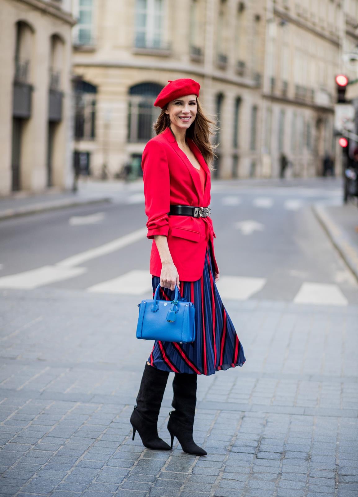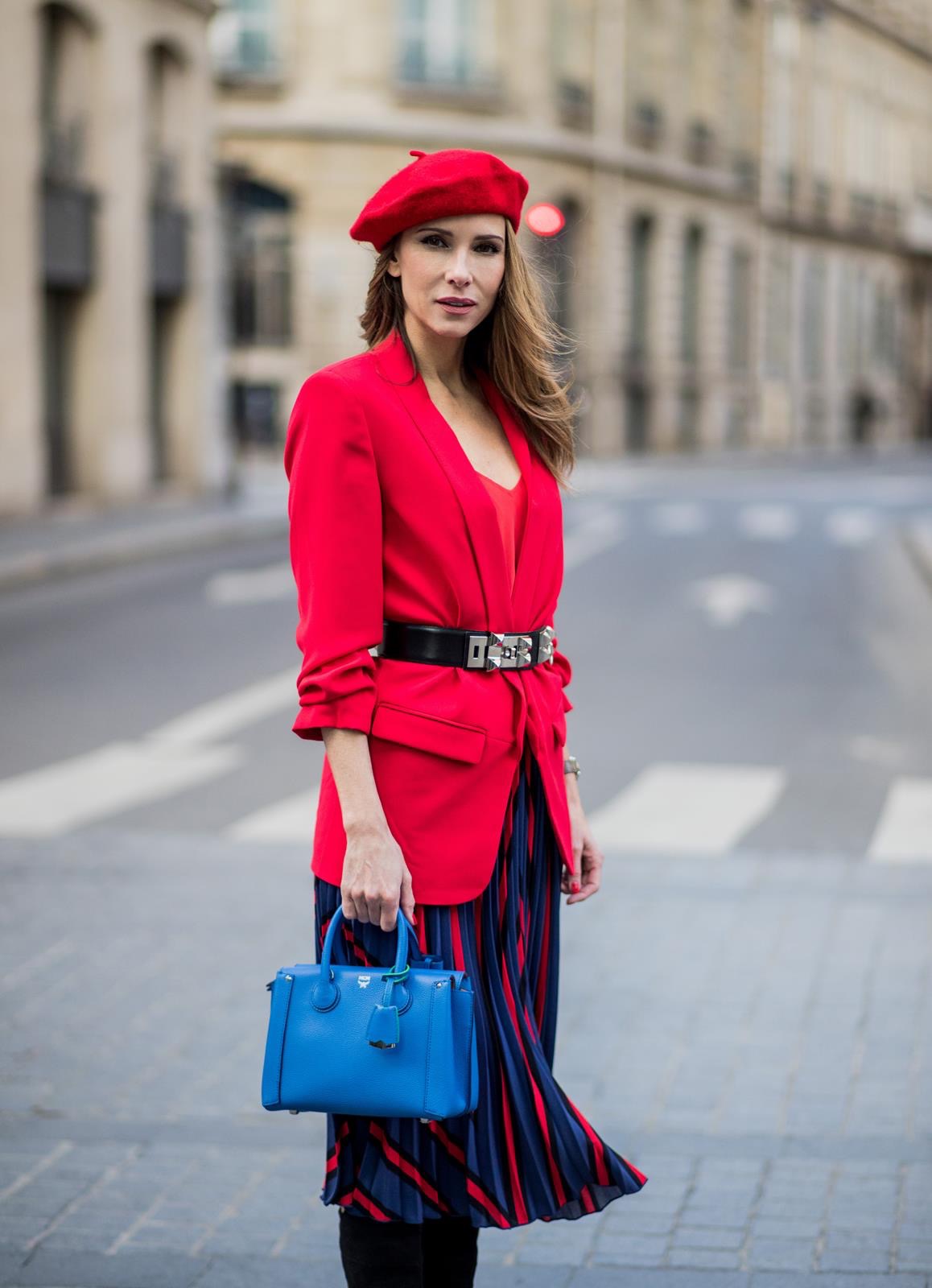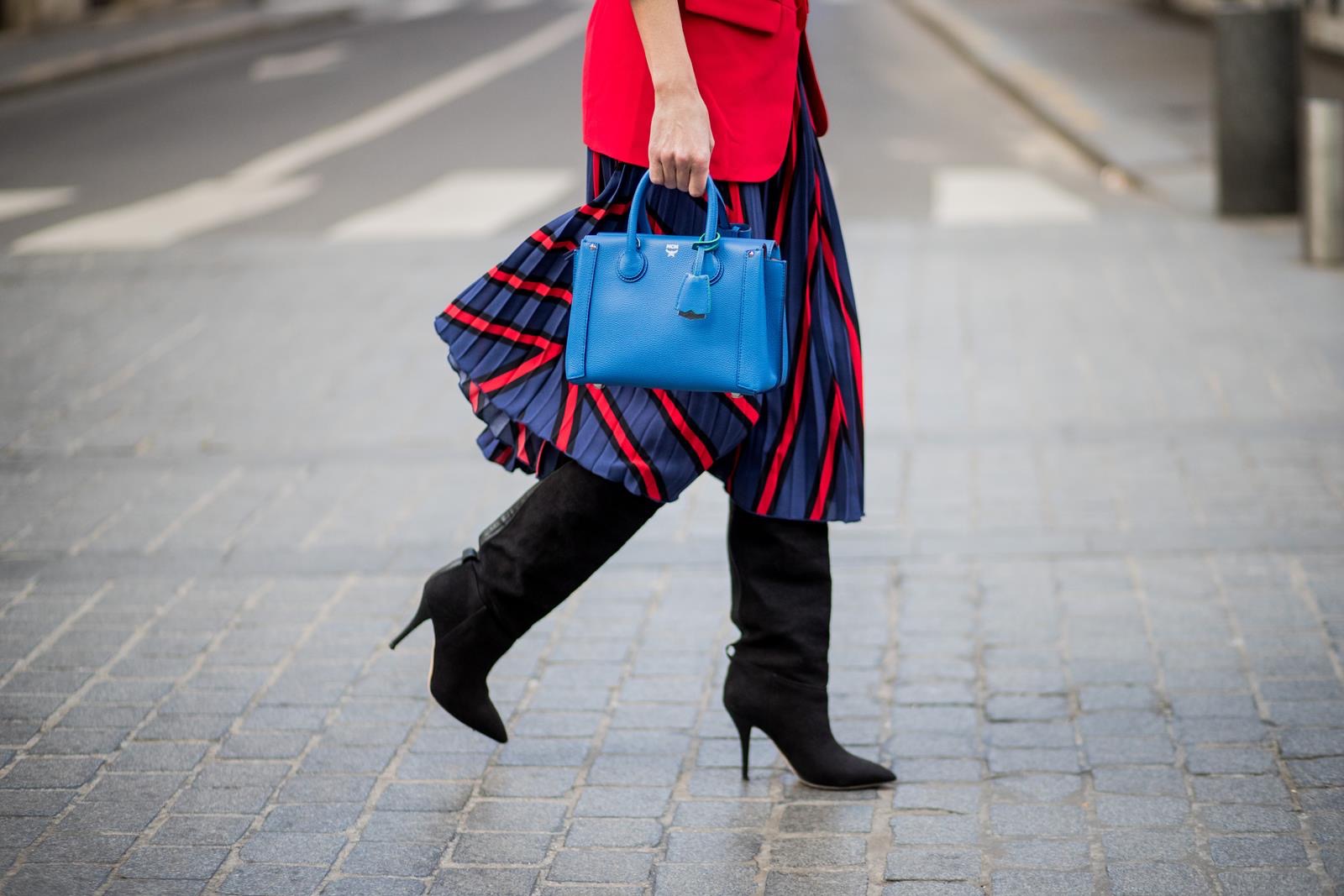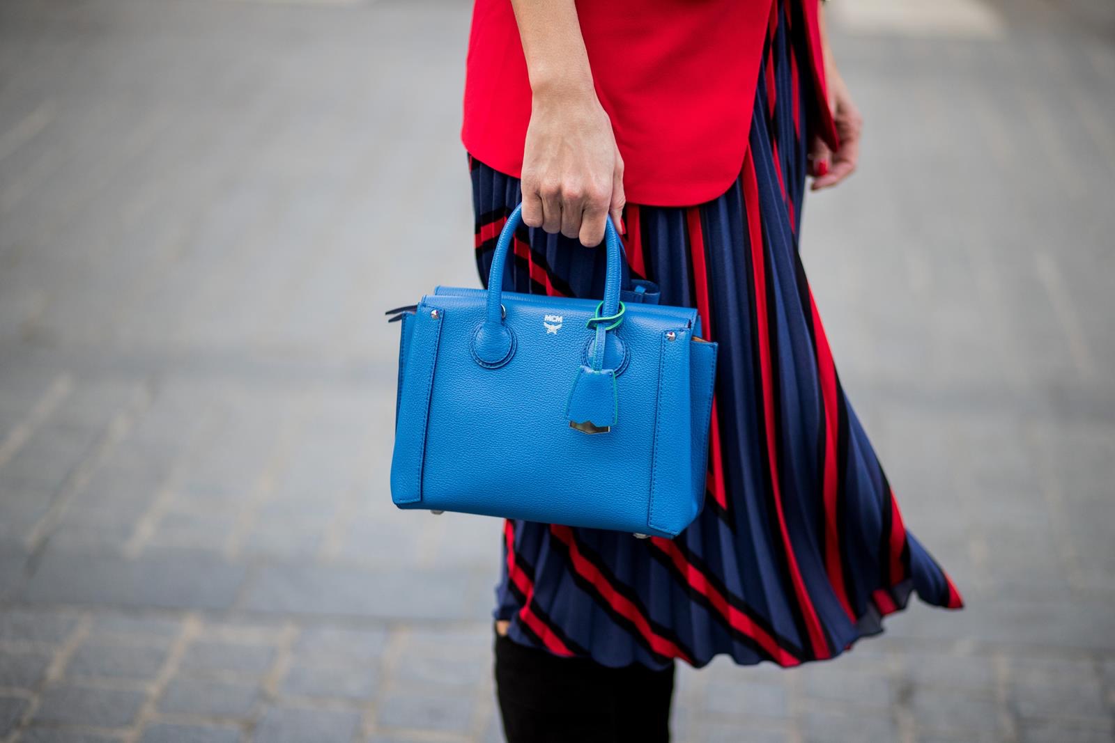 My blue Neo Milla handbag from MCM is a modern, elegant bag crafted of fine Spanish leather. The bag works wonderfully during the day or at night, is serves all occasions. It has this perfect size and this great quality that just works all the time. You can also combine it with an elegant look or with a sporty one. My black boots are from Isabel Marant a nice widely cut boot, great to wear with skirts. On my head you can see my little red beret cap from Asos, a perfect finish for this little Parisian look.