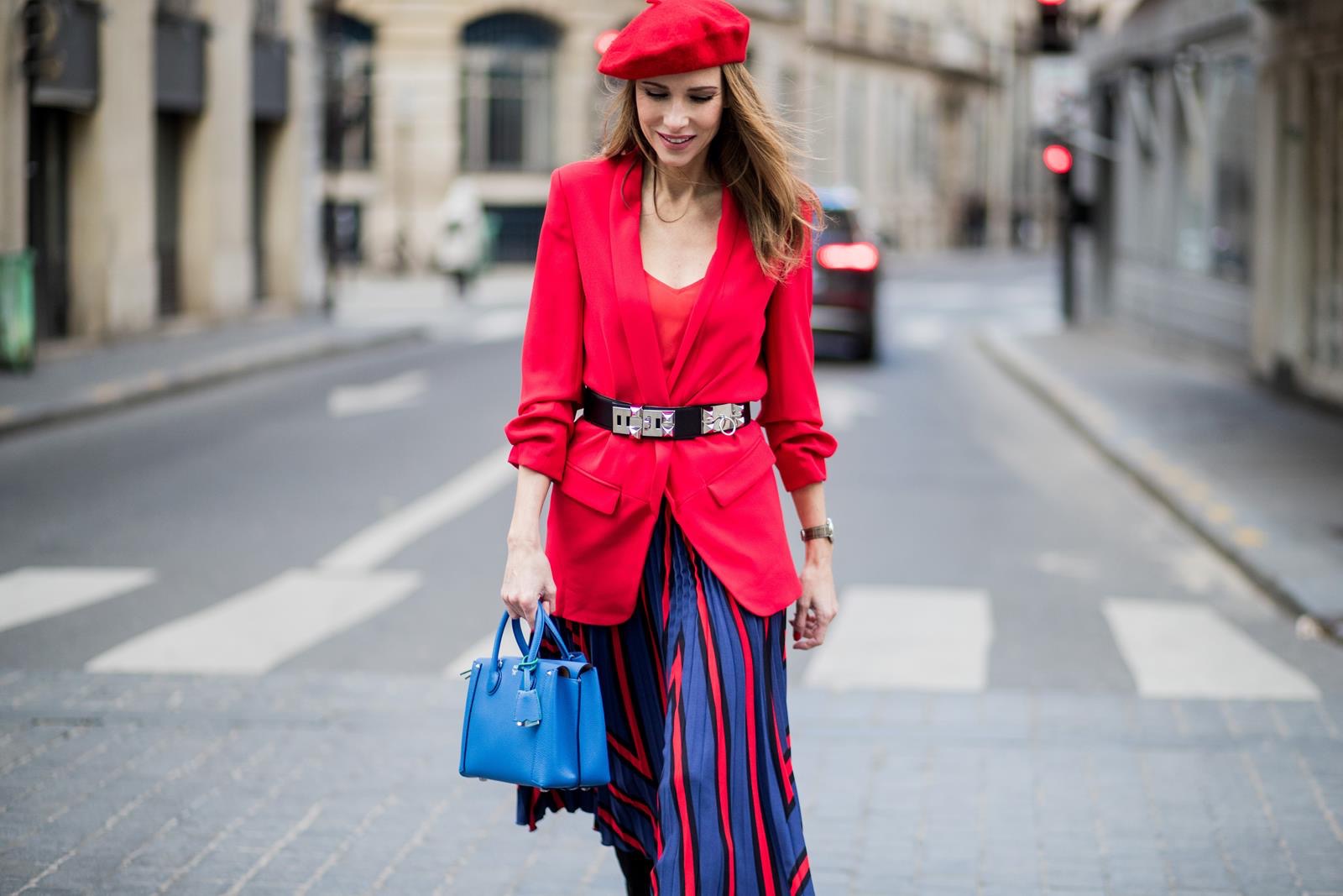 Underneath I am keeping it red with a little silk top from Jadicted. I love the tops in all kind of colors, they are so easy to style and they fit so many looks. To get back to my waist belt this black model is from Hèrmes with a fancy golden buckle in the front. You don’t need any more accessories when wearing this piece, it gives an allover glam to your look. The long blue skirt with red stripes is from H&M and it matches perfectly with my top. And I love how it swings around my legs when I am walking.