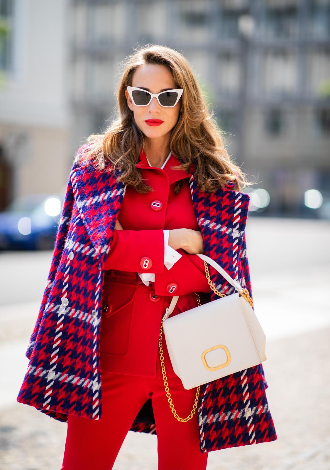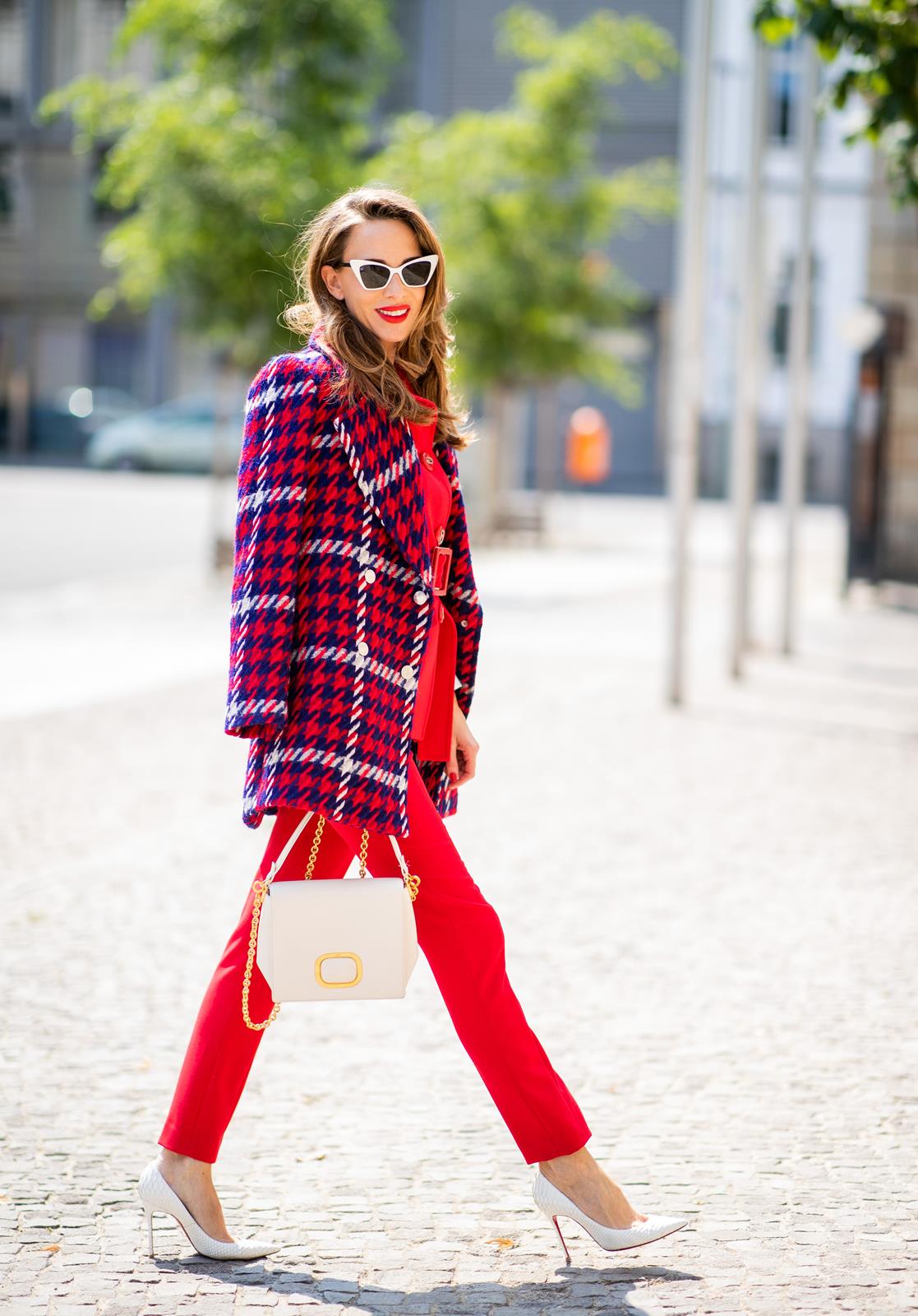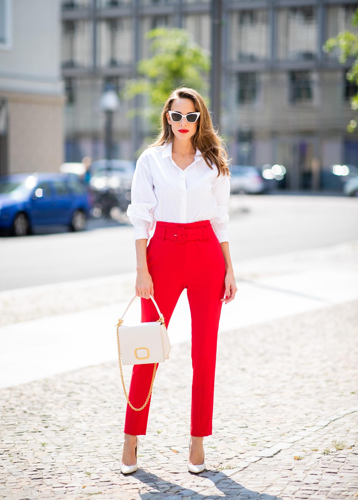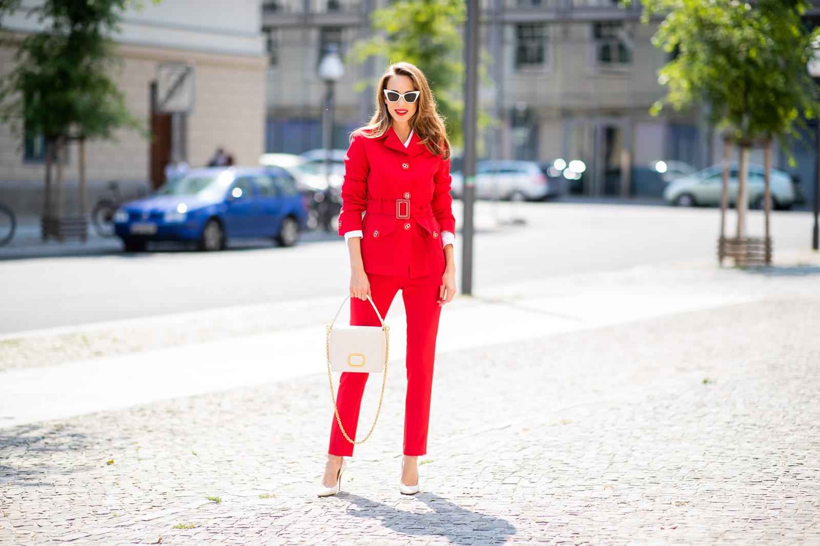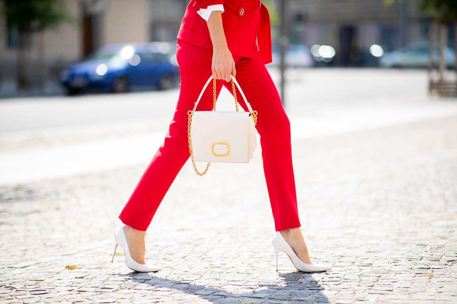 To go with my suit look I slipped into my white snake pumps from Christian Louboutin. They go great with this outfit, they add a bit of funkiness to the elegant look. Just like the cool cat-eye acetate sunglasses in white and black by Saint Laurent. The shape is trendy and cool, great to mix up my combination. For another fancy touch I am carrying my white handbag with a golden chain from Roger Vivier. And last but not least a cool beret in flashy red from Asos – it just gives this last litte finishing touch.